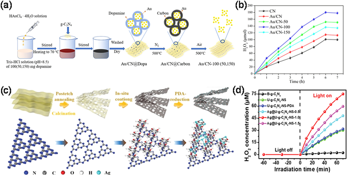 For example, Song et al. reported a method for loading and stabilizing gold nanoparticles on C3N4 substrates (Fig. 6a), which simultaneously enhanced the stability of the catalyst and the performance of H2O2 photosynthesis. The precursor was annealed for 2 h at 500 ℃ with N2, exhibiting the best performance of 1320 µmol/L, which is 2.3 times that of pure C3N4. Among the various samples synthesized, Au/CN-100 had the largest production amount (Fig. 6b) [50].