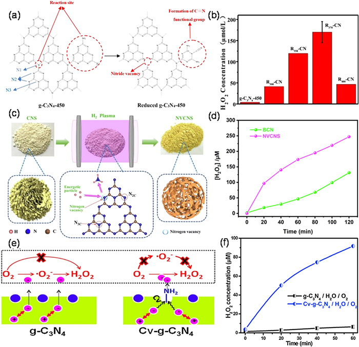 Zhu's group synthesized reduced g-C3N4 with N vacancies by heat treatment with NaBH4 under N2 [58]. The N vacancies in C3N4 were formed by reduction treatment involving a cleavage reaction with the pyridine nitride of s-triazine-C3N4 (Fig. 7a). This led to the narrowing of energy bandgap to boost visible light-driven WOR capability [62,63]. In particular, N vacancies can promote the spatial separation of photogenerated e- and h+. As shown in Fig. 7b, R370CN could achieve photocatalytic production of H2O2 from pure H2O and ambient atmosphere under visible light, reaching 170 µmol/L in 1 h. Zheng et al. prepared N-vacancy CN spheres (NVCNS) in H2 plasma by low-temperature heating (Fig. 7c). Under visible light, NVCNS containing N vacancies could produce 250 µmol H2O2 in 2 h (Fig. 7d) [59]. In another investigation, Han et al. achieved the incorporation of two distinct N vacancy types into g-C3N4 through the pyrolysis of melamine under both Ar and NH3, coupled with subsequent HNO3 oxidation. It was worth noting that the pyrolysis atmosphere had a significant effect for producing N vacancies. The N vacancies in N groups (N3C) and sp2 hybrid N atoms (N2C) could be formed under NH3 pyrolysis and Ar pyrolysis, respectively [60]. For carbon nitride, C vacancies building is another way for defect control. For example, Li et al. proposed a thermal annealing method under Ar atmosphere to generate C vacancies in g-C3N4 (Cv-g-C3N4) [61]. The results showed that g-C3N4 with C vacancies exhibited higher photocatalytic production of H2O2 compared to pure g-C3N4. The increased photocatalytic performances were attributed to extending visible light absorption and increasing charger separation with Cv-g-C3N4. Furthermore, the NH3 groups surrounding carbon vacancies changed the H2O2 production pathway from two-step indirect reaction to one-step direct reaction, thereby accelerating the synthesis of H2O2 (Fig. 7e). As shown in Fig. 7f, the yield of Cv-g-C3N4 was 14 times that of g-C3N4.