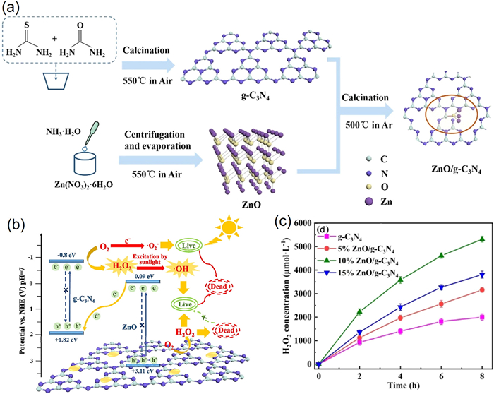| Fig. 8. (a) Synthetic process of ZnO/g-C3N4 heterojunction photocatalyst. (b) Mechanisms of H2O2 production and photocatalytic sterilization. (c) Performance of different catalysts for H2O2 generation. Copied with permission [66]. Copyright 2021, Elsevier. | |