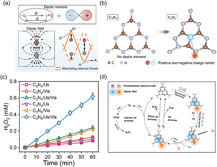 Li et al. reported a novel process with dipole field-driven spontaneous polarization in N-rich triazole-based carbon nitride (C3N5) to boost the photocatalytic synthesis of H2O2 [71]. The existence of dipole field facilitated redox reactions by influencing its electron cloud distribution. Fig. 9a illustrated the dipole field and its variations under external force. Density functional theory (DFT) revealed that C3N5 displayed a dipole moment, while C3N4 did not show any dipole moment (Fig. 9b). The significant dipole moment in C3N5 enabled the utilization of dipole field-induced spontaneous polarization to leverage photogenerated charge separation dynamics. The results showed that the H2O2 production rate of C3N5 was 3809.5 µmol g−1 h−1 (Fig. 9c), which was superior to the performance of pure g-C3N4. The reaction mechanism was shown in Fig. 9d. This straightforward technique address a critical need in facilitating the transfer of photoinduced carriers through the introduction of structural engineering induced dipole field.