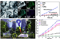 | Fig. 10. (a, b) scanning electron microscope (SEM) images of CPN. (c–e) The corresponding energy dispersive spectrometer (EDS) elemental mappings of constituent elements for CPN. (f) Time profiles of photocatalytic H2O2 production with different catalysts. Copied with permission [27]. Copyright 2020, Royal Society of Chemistry. (g) Mechanisms of CO2 reduction and H2O2 production process. (h) Photocatalytic H2O2 production of various catalyst. Copied with permission [81]. Copyright 2019, Elsevier. | |