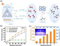 | Fig. 15. (a) Mechanism diagram of in-situ photocatalytic H2O2 production and propylene epoxidation. (b) H2O2 production, PO production, and remaining H2O2 during the reactions. (c) Productivity and selectivity of PO. Copied with permission [98]. Copyright 2023, American Chemical Society. | |