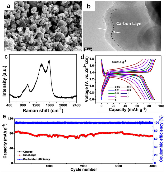 For example, the carbon coating layer on NaVPO4F (C—NaVPO4F) to form a stable surface layer, improving its electronic conductivity and stability [61]. The C—NaVPO4F was prepared by a facile soft template method. SEM analysis reveals that C—NaVPO4F is composed of irregular primary particles, exhibiting diameters spanning from 100 nm to 200 nm (Fig. 1a). In Fig. 1b, it is evident that the NaVPO4F particles are enveloped by a uniform, transparent carbon coating measuring 20 nm in thickness. In Fig. 1c, the Raman spectrum provides insights into the structural characteristics of the material, with the intensity ratio (ID/IG) of the diffraction peaks indicating the degree of graphitization and defect density within the carbon coating. For the C—NaVPO4F sample, the calculated ID/IG value of 0.94 signifies a notable degree of graphitization, implying a well-ordered and crystalline nature of the carbon cladding layer, suggesting enhanced electrical conductivity and stability. When the battery was operated in a voltage rage of 0.6–1.8 V at 0.05 A/g, a voltage plateau of 1.36 V was utilized (Fig. 1d). Additionally, the long-term cycling performance of the system was assessed at 1 A/g (Fig. 1e). Remarkably, even after the 4000th cycles, the battery exhibited superior capacity retention is 89.3%. The outstanding cycling stability observed in this study can be attributed to the synergistic effects of the electrolyte and the carbon coating layer, which collectively enhance the stability of NaVPO4F, particularly at high operating voltages.
