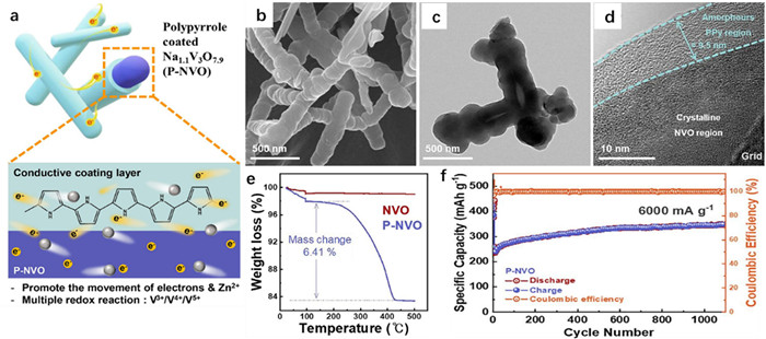 In addition to carbon layer coating technology, coating with polymer materials is also an important method to enhance the stability of cathode materials. Such as PAN, PEDOT, and PPy, exhibit significant advantages in improving electrode performance due to their excellent conductivity and flexible chemical structures. The research by Saiful Islam et al. [62] on the Na1.1V3O7.9 (NVO) nanorod cathode coated with PPy (P-NVO) provides significant insights into enhancing the stability of cathode materials for AZIBs, particularly under high-voltage conditions. The study demonstrates that PPy coating not only improves the electronic conductivity and Zn2+ diffusion kinetics but also significantly stabilizes the NVO structure at elevated voltages, thereby ensuring the effective utilization of the V3+/V4+/V5+ redox reactions in the NVO cathode. This leads to a higher discharge capacity, improved power capability, and superior cycling stability compared to the uncoated NVO cathode. Fig. 2a is the schematic illustration of the structure of P-NVO. From Figs. 2b and c, it can be found that the morphology of P-NVO is a rough surface nanorod, and further high-resolution TEM (Fig. 2d) reveals a uniform PPy layer with a thickness of 9 nm on the surface of NVO. The TGA curves also confirm that the PPy coating layer on the surface of NVO (Fig. 2e). Notably, even at a high current density of 6000 mA/g, the P-NVO cathode exhibits outstanding cycling stability over 1100 cycles without capacity loss (Fig. 2f). This significant enhancement in performance, particularly at high voltages, is attributed to the conductive PPy layer, which acts as a protective shield, enhancing the structural integrity and electronic properties of the NVO nanorods under demanding electrochemical conditions.
