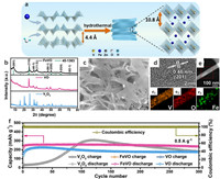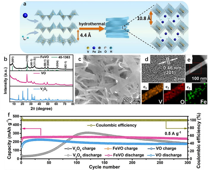 | Fig. 3. (a) Schematic illustration of the preparation and the crystal model of FeVO. (b) XRD patterns of FeVO, VO and commercial V2O5. (c) SEM images; (d, e) HRTEM and STEM-EDX elemental mapping of FeVO nanobelt. (f) Cycling performance of FeVO, VO and commercial V2O5; at 0.5 A/g. Adapted with permission [66]. Copyright 2021, Elsevier. | |