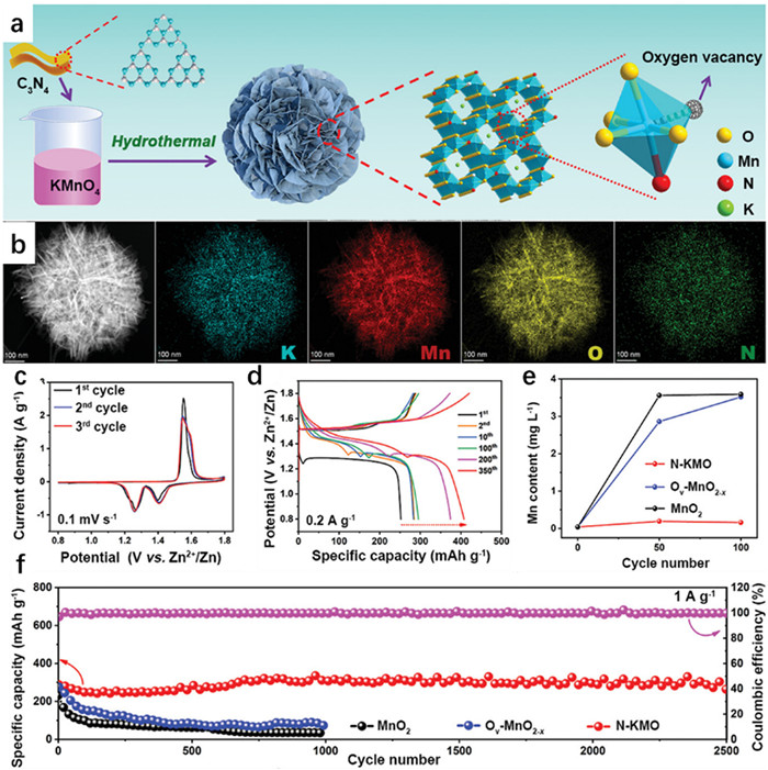 | Fig. 4. (a) Schematic illustration of the synthesis and the N doped crystal structure. (b) STEM-EDX elemental mapping, (c) CV curves at a scan rate of 0.1 mV/s. (d) GCD curves at a current density of 0.2 A/g of N-KMO. (e) Mass content of dissolved Mn in a 2 mol/L ZnSO4 aqueous electrolyte during cycling. (f) Cycling performance at a current density of 1 A/g of MnO2, Ov−Mn2-x, and N-KMO. Adapted with permission [67]. Copyright 2022, Wiley-VCH. | |