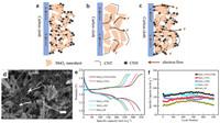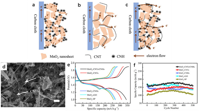 | Fig. 7. (a-c) Schematics of electron pathway in MnO2—CNHs, MnO2—CNTs, and MnO2—CNTs/CNHs electrode. (d) SEM image of MnO2—CNTs/CNHs. (e) Galvanostatic charge and discharge profiles of the 4th cycle at 0.3 A/g. (f) Cycling performance at 3 A/g of MnO2—CNTs/CNHs, MnO2—CNTs, MnO2—CNHs, MnO2-rGO and MnO2-SP electrodes. Adaped with permission [77]. Copyright 2020, Elsevier. | |