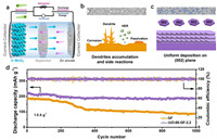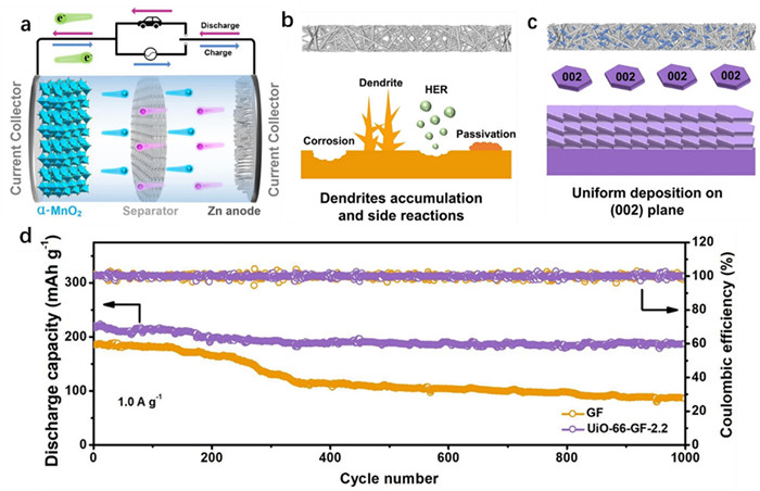 Metal-organic framwork (MOF) are porous crystalline material that self-assemble from metal ions and organic ligands. They possess an extensive pore volume, high specific surface area, and adjustable pore sizes, facilitating uniform ion transport. Due to Zr-based MOF exceptional chemical and thermal stability, mechanical robustness and high surface area with tunable porosity. These properties make them for maintaining structure integrity and performance in the demanding conditions of AZIBs, ensuring efficient Zn2+ transport and enhanced battery safety. A recent study by Song et al. [79] investigates the use of a Zr-based metal-organic framework (MOF) functionalized GF separator, known as (UiO-66-GF), to enhance the electrochemical performance of AZIBs. The UiO-66-GF separator improves charge carrier transport and favors the orientation of the (002) crystal plane, which enhances corrosion resistance and enables dendrite-free zinc deposition. To evaluate the efficacy of the UiO-66-GF separator, full cell with an α-MnO2 cathode were assembled (Zn|UiO-66-GF|MnO2). Fig. 8a presents a schematic diagram of the full cell model. The presence of Ui-66 promotes the preferential orientation of the (002) crystal plane, promoting the horizontal growth of Zn2+ and effectively preventing dendrites formation (Figs. 8b and c). DFT calculations indicate that the (002) crystal surface exhibits weakened adsorption of H, which enhances the corrosion resistance of the Zn anode and effectively suppresses the hydrogen evolution reaction (HER). As shown in Fig. 8d, the full cell (Zn|UiO-66-GF-2.2|MnO2) demonstrates excellent long-term cycling stability, maintaining a high discharge capacity of 186.55 mAh/g after 1000 cycles with a capacity retention of 85%. This study highlights the significant role of advanced separator materials in enhancing battery performance. The innovative approach of using MOF-functionalized separators not only mitigates common issues such as dendrite formation and corrosion but also significantly boosts the cycling stability and capacity retention of AZIBs.