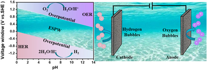 | Scheme 1. Pourbaix diagram illustrating the voltage window of aqueous electrolytes, along with a schematic of hydrogen and oxygen production processes. | |