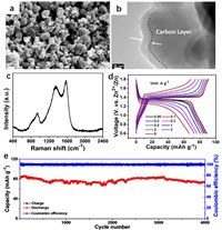 | Fig. 1. Morphology and performance of carbon-coated NaVPO4F sample: (a, b) SEM and TEM; (c) Raman spectrum; (d) Galvanostatic charge-discharge curves at various current density from 0.05 A/g to 5 A/g; (e) Long-term stability of the battery at 1 A/g. Adapted with permission [61]. Copyright 2021, American Chemical Society. | |