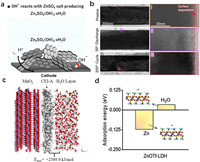 The formation of the CEI results from the interaction between oxide-based cathode materials (e.g., MnO2 and V2O5) and H+ during cycling. Side reaction involving OH- with electrolyte salts, such as ZnSO4 (Fig. 5a), lead to the depletion of H+ and the formation of a loose and porous CEI layer [70]. This layer can develop cracks upon contact with the electrolyte, allowing the aqueous electrolyte to penetrate and reach the interior of the cathode. When the aqueous electrolyte contacts the cathode, H+ and OH− ions can react with the cathode material (e.g., V-based oxides), cousing lattice degradation (Fig. 5b) [71]. Liu et al. [72] have effectively demonstrated the interaction energy at the alkane-H2O interface (CEI-A) through theoretical calculations (Fig. 5c). The artificially prepared CEI-A can effectively reduce both Mn dissolution and the contact of conductive graphite with water. This inhibition prevents the reaction: C + xH2O → COx + 2xH++ 2xe-, thereby enhancing the stability of the system. Dai et al. [73] examined the CEI of Znx(OTf)y(OH)2x-y·nH2O (ZnOTf-LDH) for its species permeability. DFT calculations revealed that this CEI exhibits hydrophobicity and high affinity for Zn (Fig. 5d), which contribute to stabilizing the interfacial structure and preventing H2O intercalation.
