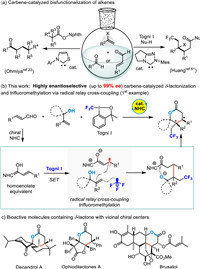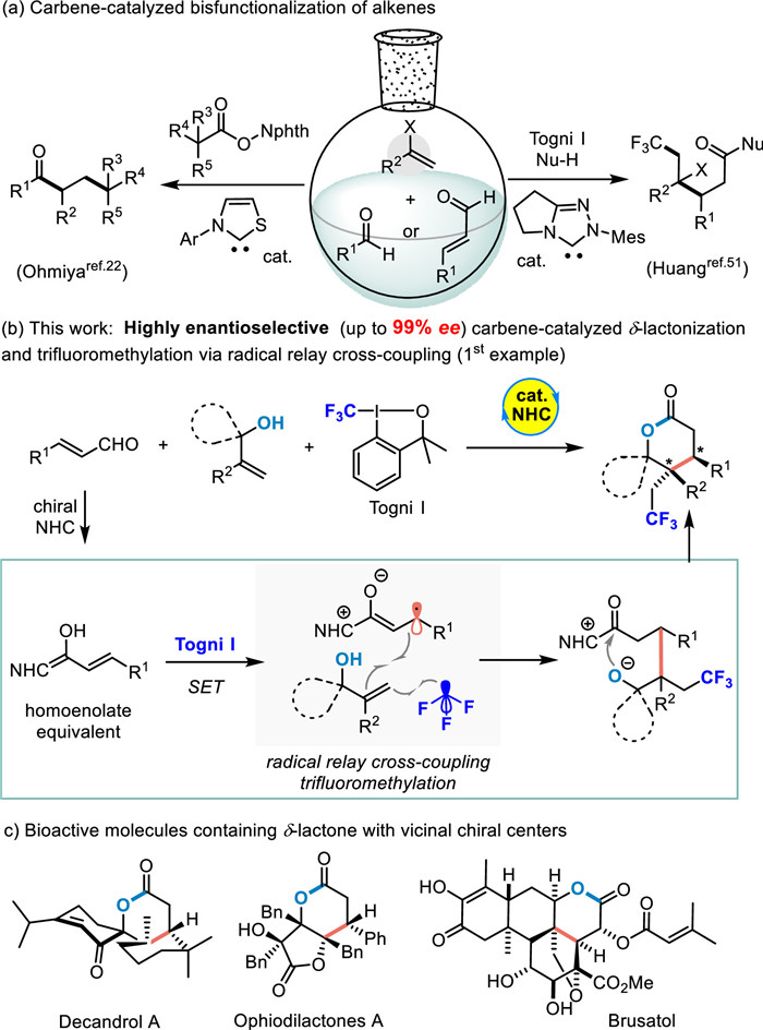 In summary, we have developed an N-heterocyclic carbene (NHC) catalyzed highly enantioselective cyclisation and trifluoromethylation of olefins with cinnamaldehydes via radical relay cross-coupling in the presence of Togni reagent, providing poly-substituted δ-lactones bearing with two adjacent stereogenic centers at β- and γ-positions in good to high yields, moderate diastereoselectivities, and high to excellent enantioselectivities. Further computational studies explain that the radical cross-coupling step is the key to determining the enantioselectivity. DFT calculations also reveal that the hydrogen-bonding interaction plays a vital role in the promotion of this chemistry. Further investigations on novel radical relay cross-couplings catalyzed by NHCs are ongoing in our laboratory.