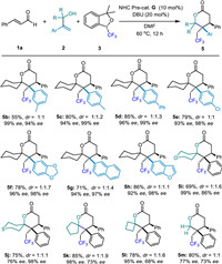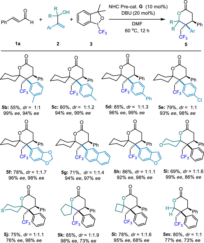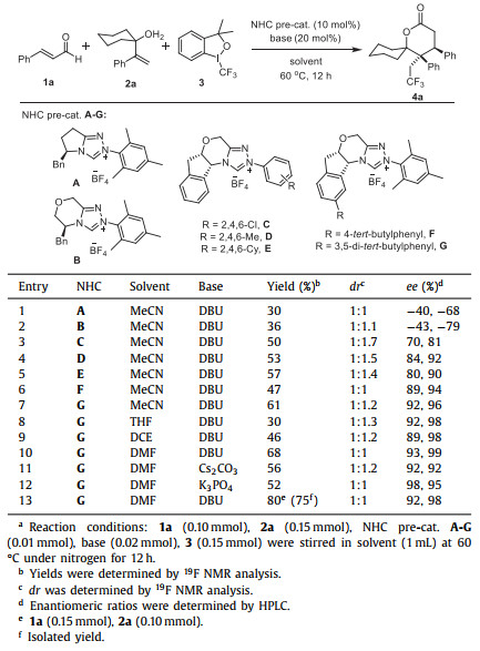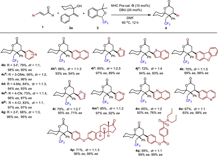 We began our investigation with trans-cinnamaldehyde 1a, 1-(1-phenylvinyl)cyclohexan-1-ol 2a, and Togni I as model substrates. With the NHC pre-catalyst A, the desired product 4a was formed in 30% yield with 1:1 dr and moderated ee (entry 1). A briefly screen of chiral NHC pre-catalysts indicated that the aminoindanol-derived NHC-pre cat. D afforded better yield and enantioselectivity (entry 4). Replacing the N-phenyl unit of cat. C with electron-withdrawing trichlorophenyl or replacing the N-phenyl unit with a bulkier cyclohexyl group reduced enantioselectivity and did not significantly improve yield (entries 4 and 5). Using 4-tert-butylphenyl-derived aminoindanol F as pre-NHC cat., the ee value was increased slightly. To our delight, when introducing 3,5-di-tert-butylphenyl group to further increase the bulkiness of aminoindanol scaffold (pre-NHC cat. G), excellent enantioselectivity and moderate yield were achieved (entry 10). In addition, highly polar solvent DMF tent to provide better catalytic performance. Exchanged DBU with inorganic base did not offer satisfied results (entries 11 and 12). Finally, adjusting the ratio of substrates 1a and 2a afforded product 4a with 75% yield, 1:1 diastereoselectivity, and excellent ee (entry 13).