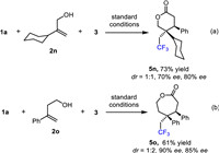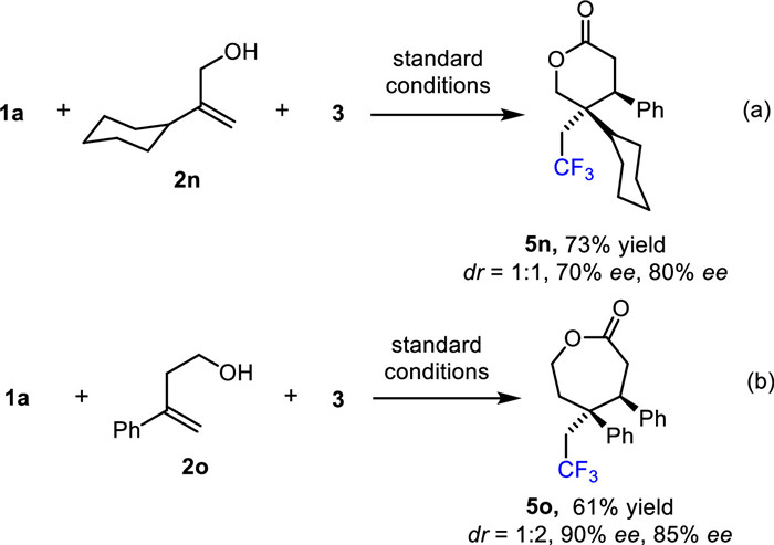 In addition, when we used 2-cyclohexylpropylpropyl-2-en-1-ol (2n) as substrate under standard conditions (Scheme 4a), we could still successfully obtain the corresponding lactone 5n (73% yield, dr = 1:1), but tolerate some losses in ee values (70% ee, 80% ee, respectively). Pleasingly, when we carried out the experiment by using 2o instead of 2a, the corresponding 7-membered lactone 5o was also achieved with an accepted result of 61% yield, dr = 1:2, 90% and 85% ee, respectively.