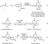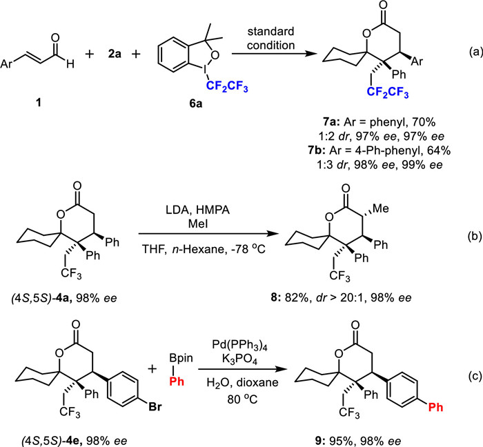 To further demonstrate the practicality and versatility of this method, we next replaced the trifluoromethyl group with pentafluoroethyl substituent in Togni reagent (6a), and the result showed that the reaction could still be well conducted under standard conditions (Scheme 5a). Methylation at α position of carbonyl group of isomer (4S,5S)-4a yielded the corresponding product 8 in good yield and excellent stereoselectivity (Scheme 5b). (4S,5S)-4e was successfully and equivalently converted to biphenyl compound 9 by Suzuki coupling reaction (Scheme 5c).