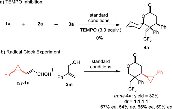To verify the mechanism, several experiments were carried out. As shown in Scheme 6a, 2,2,6,6-tetramethylpiperidinyloxy (TEMPO) effectively inhibited the occurrence of the reaction, suggesting that the reaction may be a radical pathway. In addition, the radical clock experiment with cis-1u as substrate generated trans-lactone, which suggested the ring opening and closing processes of cyclopropane, and the results were consistent with these reported by the Huang group (Scheme 6b).