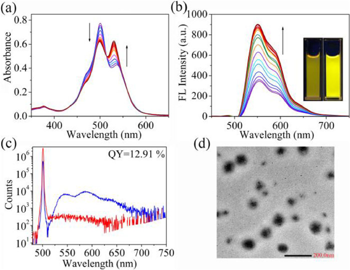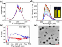 | Fig. 1. (a) UV−vis absorption and (b) fluorescence spectral changes of PDI-nm (1 × 10−5 mol/L) after adding 2.0 equiv. of ns-Q[10] in aqueous solution, inset: images of PDI-nm (left) and PDI-nm/ns-Q[10] (right) under 365 nm light. (c) Fluorescence quantum yield of PDI-nm/ns-Q[10]. (d) TEM images of PDI-nm/ns-Q[10] assembly. | |