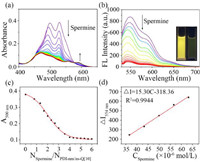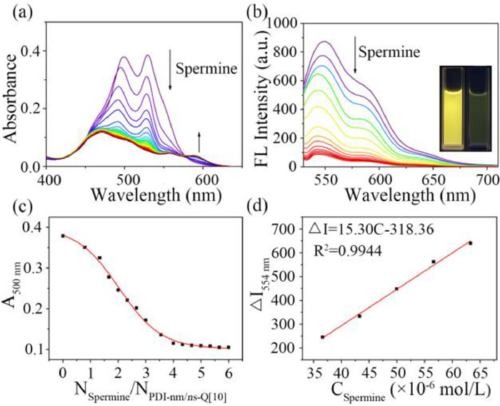 | Fig. 2. (a) UV–vis adsorption and (b) fluorescence spectra of PDI-nm/ns-Q[10] (1 × 10−5 mol/L) with the addition of different concentrations of spermine (0−4 × 10−5 mol/L). Inset: photographs of PDI-nm/ns-Q[10] (left), and PDI-nm/ns-Q[10]-spermine under UV light (right). (c) The change of absorbance at the absorption wavelength of 500 nm. (d) Linear relationship between PDI-nm/ns-Q[10] fluorescence intensity and spermine concentration. | |