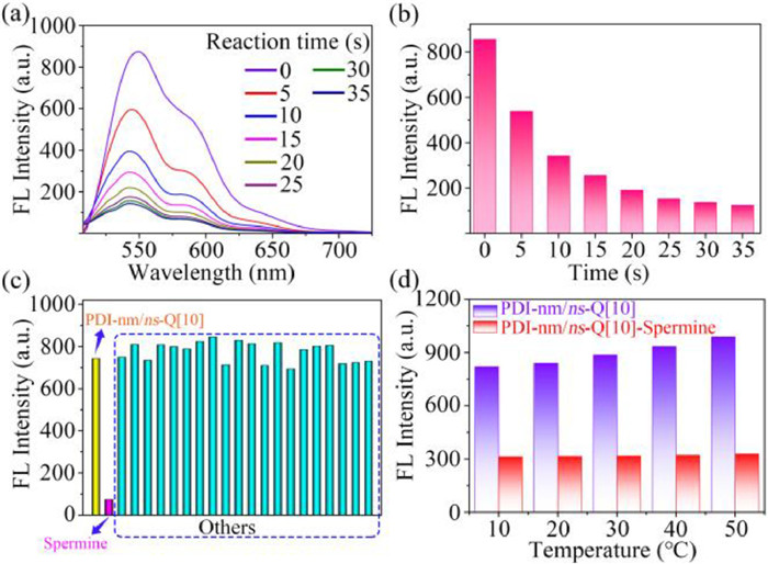 | Fig. 3. (a) Fluorescence spectra of PDI-nm/ns-Q[10] (1 × 10−5 mol/L) solution in the presence of spermine (4 × 10−5 mol/L) at different times intervals. (b) The fluorescence intensity of 554 nm after adding spermine for different time. (c) Fluorescence changes of PDI-nm/ns-Q[10] (1 × 10−5 mol/L) after treated by spermine and others (L-Trp, L-Met, L-Thr, L-Val, L-Lys, L-Leu, L-Iso, L-Phe, TY, TMA, DA, Cu2+, Mn2+, Fe3+, CO32−, Br−, SO32−, NO3−, HPO42−, F− (4 × 10−5 mol/L, respectively)). (d) Thermostability of PDI-nm/ns-Q[10]. | |