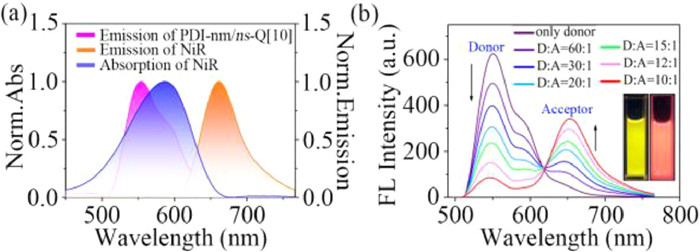 | Fig. 5. (a) Normalized emission spectra of PDI-nm/ns-Q[10], and absorption and emission spectra of NiR. (b) Fluorescence spectra of PDI-nm/ns-Q[10] (PDI-nm/ns-Q[10] = 1 × 10−5 mol/L) with different concentration of NiR. The concentrations of NiR was 1 × 10−6 mol/L. Inset: photographs of PDI-nm/ns-Q[10], and PDI-nm/ns-Q[10]/NiR under UV light (365 nm). | |