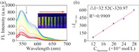 | Fig. 4. (a, b) Emission spectra and linear curve of PDI-nm/ns-Q[10] toward spermine in the concentration range of 12 × 10−6 – 28 × 10−4 mol/L. Inset: the corresponding photographs under UV-light irradiation at 365 nm. | |