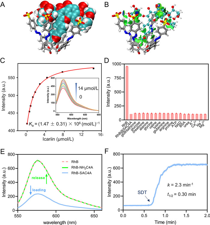| Fig. 1. (A) Optimized binding geometry of the icariin@SAC4A complex at the B3LYP/6–31G(d)/SMD (water) level of theory with Grimme’s D3 dispersion correction. (B) IGMH analysis of interaction between icariin and SAC4A, the figure was generated by Multiwfn and visualized by VMD, δginter = 0.005 a.u. Isosurfaces colored according to a blue-green-red scheme, blue indicates a strong attraction, green indicates an attraction, and red indicates a repulsion. (C) The associated titration curve at λem = 576 nm fitted according to a 1:1 competitive binding stoichiometry. Inset: competitive fluorescence titration of RhB@SAC4A (0.50/0.50 µmol/L) reporter pair with icariin (up to 14 µmol/L) in PBS (10 mmol/L, pH 7.4) at 25 ℃, λex = 540 nm. (D) Competitive release of RhB from the RhB@SAC4A complex (1.0/5.0 µmol/L) in PBS (10 mmol/L, pH 7.4) at 25 ℃ in response to various representative components of blood. RhB alone was used as a control. All results are expressed as mean ± standard deviation (SD) (n = 3). (E) Fluorescence spectra of RhB (1.0 µmol/L) before and after addition of NH2C4A (2.0 µmol/L) and SAC4A (2.0 µmol/L) in PBS (10 mmol/L, pH 7.4), 25 ℃, λem = 576 nm. (F) Release kinetics of RhB@SAC4A (2.0/12 µmol/L) after addition of sodium hydrosulfite (1.0 mmol/L SDT, a mimicking reagent of azoreductase) in PBS (10 mmol/L, pH 7.4) at 25 ℃. The release kinetics of RhB was reasonably deduced to that of icariin because of their comparable binding affinities. | |