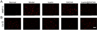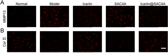 | Fig. 2. Fluorescence image of (A) MMP13 and (B) Col Ⅱ staining after icariin, SAC4A and icariin@SAC4A treatment, respectively. Model group was stimulated by LPS. Scale bar: 100 µm. | |