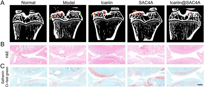| Fig. 3. (A) Micro-CT corona scanning graph of different treatment group. Red arrows indicate sclerosis of subchondral bone, orange arrows indicate the rough surface of tibial plateau, green arrows indicate osteophyte proliferation. (B) H&E staining images and (C) safranin O–fast green images of joints treated with different modalities. Scale bar: 500 µm. | |