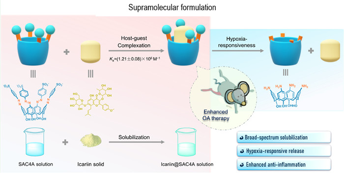 In this work, sulfonated azocalix[4]arene (SAC4A) was synthesized to improve the efficiency of icariin for OA therapy. To improve the bioavailability of icariin, a drug-carrier with good solubility and stimulus response is needed. Calix[4]arene has a wide application in drug delivery for its loading cavity [27,45,46]. The modification of azo groups deepens the cavity of calix[4]arene, thus enabling SAC4A to provide stronger binding affinity towards drugs. Furthermore, SAC4A’s sensitivity to the hypoxic inflammatory microenvironment, mediated by azo groups, enables precise and rapid drug release at the site of inflammation [47]. Sulfonate groups were decorated at the upper rim to increase the solubility and solubilization capacity. SAC4A improved the solubility of icariin approximately 4.4 × 103-fold by simple mixing its water solution with icariin solid at 50 ℃ for 30 min. SAC4A also improved the solubility of triamcinolone acetonide acetate, dexamethasone and budesonide under mild conditions through simple preparation. The host-guest formulation, icariin@SAC4A, achieved various advantages: (ⅰ) quantitative loading and reproducibility, (ⅱ) simple and repeatable preparation, (ⅲ) improved water-solubility and bioavailability of hydrophobic drugs, (ⅳ) controlled release via endogenous hypoxia stimuli. Finally, the supramolecular formulation icariin@SAC4A effectively inhibited the OA process (Scheme 1).
