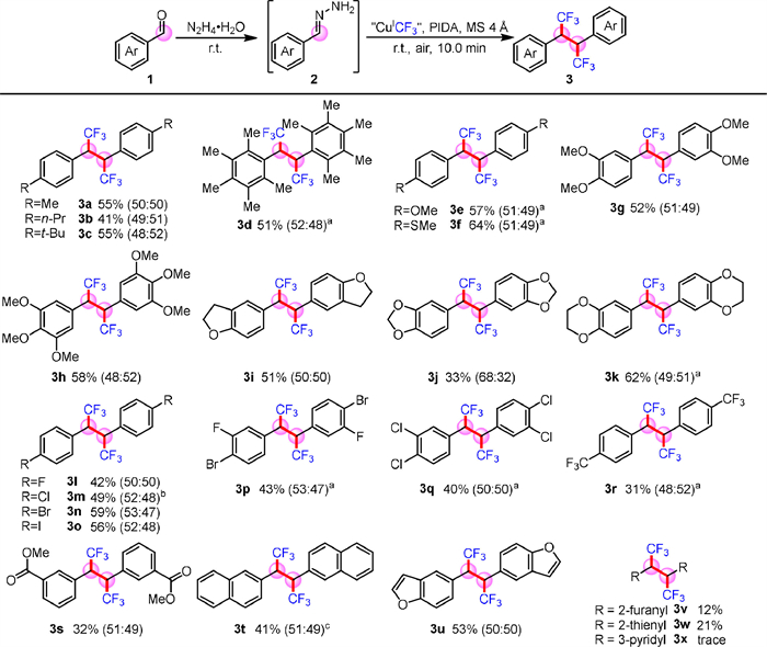| Scheme 2. The scope of hydrazone substrates. General conditions: 2 (0.2 mmol), “CuⅠCF3” (2.0 equiv., 1.0 mL DMF as solvent), PIDA (1.5 equiv.) and 4 Å molecular sieves (50.0 mg) were stirred for 10.0 min at r.t. in 20.0 mL tube under air. Unless otherwise indicated, the 19F NMR yields were shown, diastereoselectivity (syn/anti) were determined by 19F NMR given in parentheses. aUnder Ar. bIsolated yield. c1.0 mL DMSO as solvent. | |