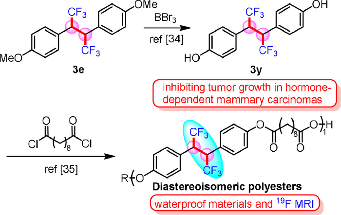 Furthermore, the demethylation of trifluoromethylative homo-coupling product 3e has unique applications in medicine and materials. It can significantly inhibit tumor growth in hormone- dependent mammary carcinomas [34], as well as has important applications in waterproof materials and 19F MRI (Scheme 3) [35].