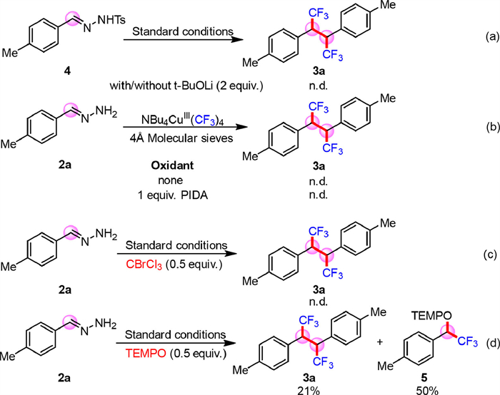 To elucidate the mechanism of this reaction, controlled experiments were carried out (Scheme 4). Firstly, N-tosylhydrazone 4 was used instead of hydrazone 2a under standard conditions, and no target product 3a was obtained, indicating that the reaction did not involve diazo compounds or metal carbene intermediates (Scheme 4a). Considering that PIDA might oxidize “CuⅠCF3” to generate “CuⅢ(CF3)3″ species, which might be responsible for this reaction, we used NBu4CuⅢ(CF3)4 as the CF3 source (Scheme 4b) and no target product 3a was detected. The addition of CBrCl3 (0.5 equiv.) as a radical inhibitor to the reaction system led to complete inhibition of target product generation, indicating that the reaction process might involve radical intermediates (Scheme 4c). When TEMPO was added as a radical capture agent to the reaction system, the trifluoromethylative homo-coupling product 3a was inhibited, and the formation of compound 5 showed that the trifluoromethyl substituted benzyl radical might be an important intermediate (Scheme 4d).