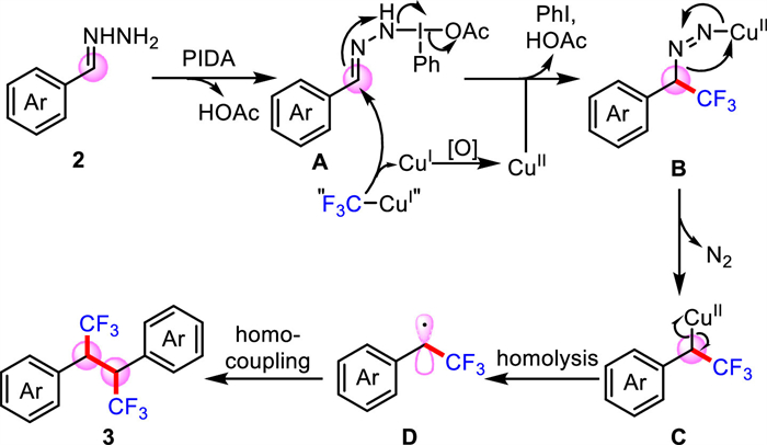Based on the above experimental results, a possible reaction mechanism is proposed. As shown in Scheme 5, PIDA is attacked by terminal N atoms of hydrazone 2 to form intermediate A and loose acetic acid. Then, under the attack of the trifluoromethyl anion from “CuⅠCF3”, intermediate A releases iodobenzene and HOAc to form CuⅡ coordinated intermediate B. Subsequently, the intermediate B releases nitrogen gas to generate organic copper(ΙΙ) species C, which forms trifluoromethyl substituted benzyl radical D due to the homolysis of the C–CuⅡ bond [36,37]. Finally, the benzyl radical D is homo-coupled to generate trifluoromethylative homo-coupling product 3.