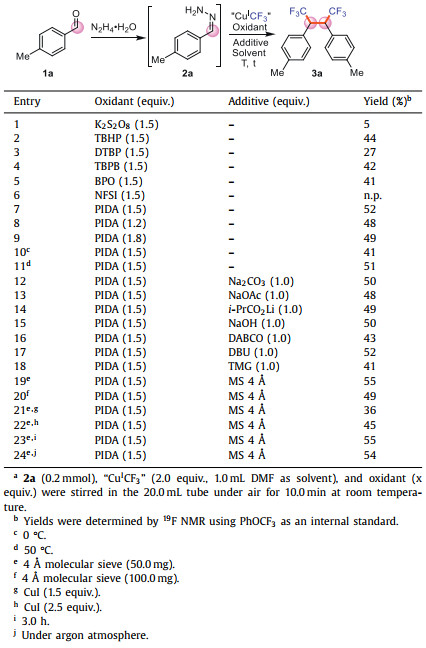 At the onset of our investigation, p-methylbenzaldehyde hydrazone (2a) was used as the model substrate, and “CuⅠCF3” (prepared in situ from CuI, TMSCF3 and CsF in 1.0 mL DMF solvent) [33] as trifluoromethyl source, to optimize the reaction conditions. When K2S2O8 was used as an oxidant, trifluoromethylative homo-coupling product 3a was detected in 5% 19F NMR yield (Table 1, entry 1). Considering the importance of oxidants for this transformation, various types of oxidants were tested (Table 1, entries 2–7). (Diacetoxyiodo)benzene (PIDA) gave the best yield (52%) of the homo-coupling product 3a among these oxidants (entry 7). Adjusting the amount of PIDA or reaction temperature did not significantly improve the yield of 3a (entries 8–11). Exploring various bases did not improve the yield of the target product 3a (entries 12–18). When 4 Å molecular sieve (MS 4 Å) was added to the reaction system, the yield of the target product 3a was increased to 55% (entry 19). Then, we investigated the influence of the amounts of 4 Å molecular sieve and CuI (entries 20–22), neither of which increased the yield of target product 3a. Extending the reaction duration or conducting the reaction in an argon atmosphere did not enhance the production of 3a either (entries 23 and 24). Finally, we obtained the optimal conditions for trifluoromethylative coupling of aldehydes via hydrazones (entry 19).