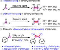 In conclusion, we have successfully pioneered the trifluoromethylative homo-coupling of aldehydes, which resulted in the formation of three C–C bonds in a single step. Mechanistic studies showed that the trifluoromethyl substituted benzyl radical was an important intermediate. This protocol introduces an innovative pathway for the deoxy-functionalization homo-coupling of aldehydes.