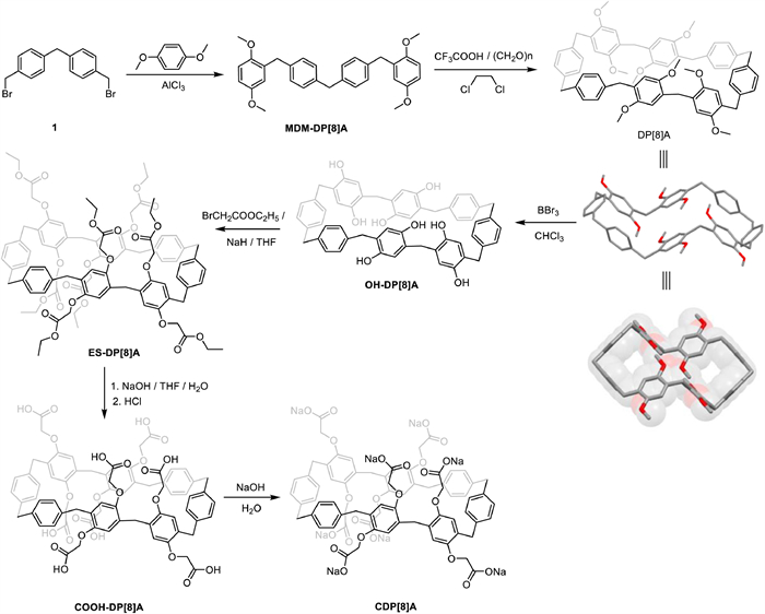 Subsequently, in order to further functionalize this new type of macrocycle, water-soluble carboxylate-functionalized DP[8]A (CDP[8]A) was successfully prepared with high yield (Fig. 1). To realize the perfunctionalization of the substituent group in DP[8]A, we first conducted a demethylation reaction of DP[8]A with an excessive amount of BBr3 to afford the hydroxy version of DP[8]A (OH-DP[8]A, Figs. S9-S11 in Supporting information). Subsequently, ES-DP[8]A was obtained with a satisfactory yield through nucleophilic substitution on OH-DP[8]A with excess ethyl bromoacetate (Figs. S12-S14 in Supporting information), and the hydrolysis of ES-DP[8]A was performed under basic conditions followed by the treatment of HCl, generating carboxylic acid-substituted DP[8]A (COOH-DP[8]A) with a high yield of 90% (Figs. S5-S17 in Supporting information). Finally, CDP[8]A was facilely obtained by treating COOH-DP[8]A with sodium hydroxide (Figs. S18-S20 in Supporting information).
