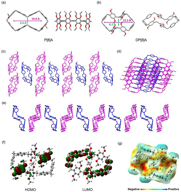 | Fig. 2. Crystal structures and cavity sizes of (a) P[8]A and (b) DP[8]A (top view and side view). Packing mode of DP[8]A viewed along the (c) [100], (d) [010], and (e) [001] directions. Hydrogen atoms were omitted for clarity. Oxygen atoms are shown in red and carbon atoms are shown in grey. (f) HOMO and LUMO orbitals of DP[8]A. (g) Electrostatic potential map of DP[8]A. | |