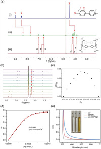 | Fig. 3. (a) Partial 1H NMR spectra (400 MHz, D2O, 298 K) of (i) MV (5 mmol/L), (ii) CDP[8]A and MV (5 mmol/L each), and (iii) CDP[8]A (5 mmol/L). (b) 1H NMR spectra of different ratios of CDP[8]A and MV (from top to bottom: CDP[8]A: MV = 10:0, 9:1, 8:2, 7:3, 6:4, 5:5; 4:6, 3:7, 2:8, 1:9 and 0:10). (c) Job's plot analysis of CDP[8]A and MV. (d) Changes in the chemical shift of MV (0.5 mmol/L) upon gradual addition of CDP[8]A (0–1 mmol/L) and the non-linear fitting curve of the plot. (e) UV–vis spectra of MV (1 mmol/L), CDP[8]A (1 mmol/L), and MV⊂CDP[8]A (1 mmol/L). Inset: photographs of (i) MV (5 mmol/L), (ii) CDP[8]A (5 mmol/L), and (iii) MV⊂CDP[8]A (5 mmol/L). | |