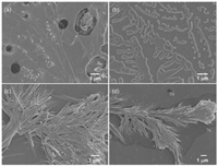 | Fig. 4. SEM images of (a) CDP[8]A (5 mmol/L), (b) MV (5 mmol/L), and (c, d) MV⊂CDP[8]A (5 mmol/L each) in aqueous solution. | |