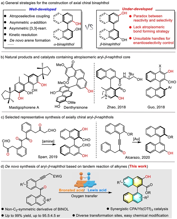 Aryl-β-naphthol is also a prominent skeleton of many natural products and bioactive compounds, such as Mastigophorene A [32], Denthyrsinone (Scheme 1b) [33]. Recently, aryl-β-naphthol derivatives have received more attention especially in organic catalysis. For example, in 2018, Zhao and coworkers [34] reported an elegant biomimetic asymmetric Mannich reaction via carbonyl catalysis. What's more, a new contribution by the group of Guo [35] using axially chiral β-naphthol derivatives has been developed (Scheme 1b). However, in these reports, relative lengthy synthetic routes (7–9 steps) were required to obtain diverse axially chiral β-naphthols, which indicated that it is highly appreciable to develop more efficient synthetic methodology for such type skeletons. Lately, a landmark achievement was realized by Sparr and coworkers [30] through a bioinspired non-canonical polyketide cyclizations, which enabled rapid access to β-binaphthols (Scheme 1c).