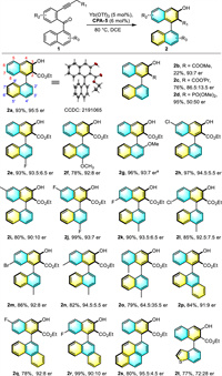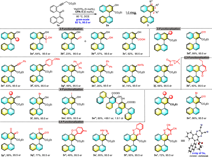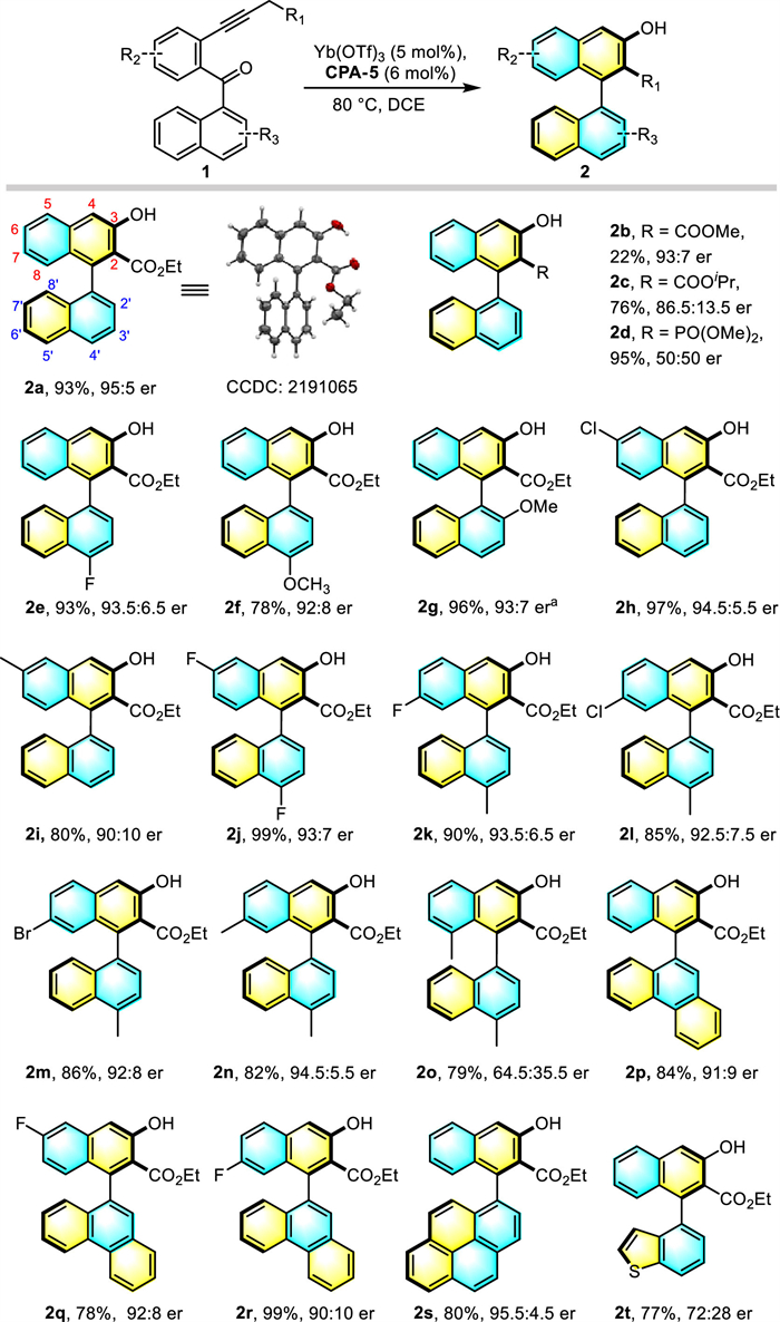 With the established optimal conditions in hand (Table 1, entry 11), we next explored the scope of this reaction for the atroposelective construction of axially chiral β-naphthols (Scheme 2). The absolute configuration of 2a was deduced to be (S) by X-ray single-crystal diffraction analysis (CCDC: 2191065) and other products were assigned by analogy. First, examination the steric hindrance of the different electron withdrawing groups at the end of alkyne showed that the introduction of a smaller methyl ester or a bulkier isopropyl ester substituent resulted in reduced both yields and enantioselectivities (2b, 2c). Interestingly, the enantiomeric ratio of the product (2d) decreased sharply (50:50) but still with excellent yield, when the substrate with a phosphonate terminal was applied. Then the electronic effects on the naphthalene ring were evaluated by the variation of substituents. Firstly, different substituents such as fluorine and methoxy groups at the C-4′ position of naphthalene ring of substrates were tested, delivering the products 2e, 2f with good yields (up to 93%) and excellent enantioselectivities (up to 93.5:6.5). However, when 2′‑methoxy substituted substrate was subjected to standard conditions, the enantioselectivity was dismal, which could be restored (2g, 96%, 93:7 er) by using octahydrosubstituted CPA* as cocatalyst under reduced reaction temperature (60 ℃). Next, substrates with a chlorine (2h) and methyl (2i) at the phenyl rings were also investigated, and excellent yields and enantioselectivities were observed. Excellent result was also achieved with substrate (2j) bearing a fluorine group at both the naphthalene and the phenyl ring. The 4′-methyl-substituted substrates with either electron-donating or electron-withdrawing groups at the phenyl of alkynyl substituted benzene were also tolerated and gave products 2k-2n in excellent yields and enantioselectivities. Yet the atroposelectivity of 8-methyl substituted substrate (2o) was reduced dramatically, indicating the great sterical impact of the C-8 substituents. To our delight, phenanthrene (2p-2r) and pyrene (2s) substituted axially β-naphthol were well tolerated (78%−99%, 91:9–95.5:4.5 er). Benzo-heterocyclic compound (2t) was also suitable for this transformation in good yield but moderate enantiomer ratio (77%, 72:28 er), implying more steric hinderance difference between the left and right part of heteroarene is beneficial to the enantioselectivity.