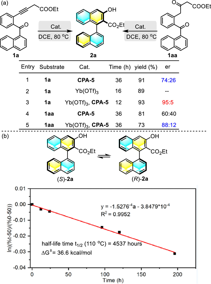 To probe the reaction mechanism, control experiments were carried out. When the reaction was ran only in the presence of chiral CPA-5, an excellent yield and moderate enantimeric ratio was observed (Scheme 4a, entry 1). When the Yb(OTf)3 was added as a single catalyst, the reaction could proceed more rapidly with almost equal yield (91% vs. 89%) obtained in a quite short time (16 h vs. 36 h, entry 2). These results imply that great background reaction need to be suppressed in order to achieve excellent enantioselectivity. Interestingly, when combination of CPA-5 with Yb(OTf)3 (entry 3), a superior enantioselectivity was observed and the reaction time was further shorted, demonstrating a synergistic or cooperative effect exerted important effect in the catalytic processes. Then, the diketone 1aa, serendipitously isolated from gram-scale reaction, was also subjected to the optimal reaction condition, which only afforded the corresponding 2a in 73% yield and compromised stereoselectivity (88:12 er vs. 95:5 er, entry 5). The result indicated that 1aa is likely to be the intermediate, but substrate 1a may be a more effective substrate in this system. We then checked reaction process and no obvious 1aa was accumulated during the reaction. Finally, a series of thermal racemization experiments with the prepared axially chiral β-naphthol 2a were carried out to gain insight into its conformational stability. The half-life of enantiopure 2a was about 4537 h at 110 ℃ in toluene and the rotation barrier ΔG‡ was identified to be 36.6 kcal/mol, thus rule out of the probable racemic effect of prolong reaction time (Scheme 4b).