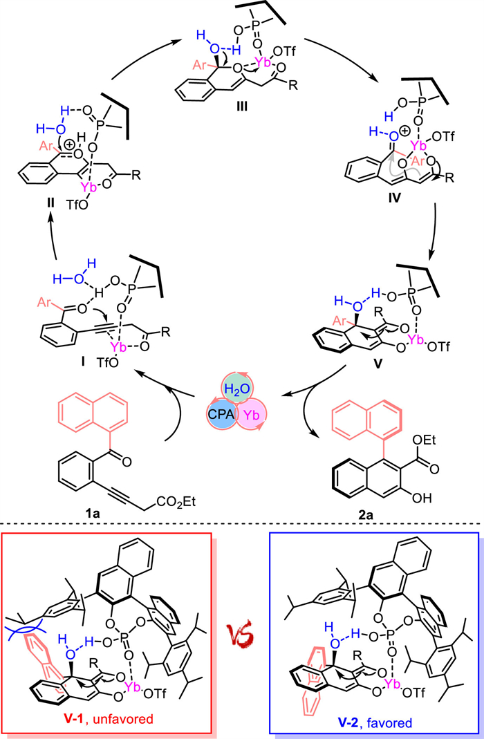 Based on these results, a possible working mechanism with 1a as an example was then proposed. As shown in Scheme 5, the coordinative complex Ⅰ undergoes an intramolecular 6-endo-dig cyclization to give oxonium intermeidate Ⅱ, which is attacted by CPA tethered water (adventitiously introduced by solvent) to form hemiketal Ⅲ, then followed by intramolecular aldol cyclization from the Re face of the ketone and E1cB elimination, delivering the desired β-naphthol 2a via central-to-axial chirality transfer. In addition, a tentative enantioselectivity induction model is proposed, wherein the sterically hinderance between naphthyl motif and the peripheral isopropyl of the CPA restrict the rotation of the atroposelectivity determining C—C bond [50]. Obviously, there is less steric clashes of rotamer Ⅴ-2, which make it favor over the rotamer Ⅴ-1, thus ensured the observed (S)-atropisomer.