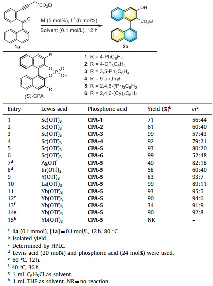 Due to the oxophilic properties of rare earth metals, a series of rare earth metals were intuitively selected as our candidate cocatalysts, to promote a tandem hydrolysis/cyclization of the engineered enynone (1a). We evaluated Sc(OTf)3 with different chiral phosphric acids (CPA), which are now prevailing in asymmetric catalysis. As expected, the combination of Sc(OTf)3 (5 mol%) and CPA-1 (6 mol%) promoted the reaction at 80 ℃ in 1,2-dichloroethane (DCE), affording the desired 2a in 71% yield, but the atropisomeric ratio was only 56:44 (Table 1, entry 1). Various other chiral CPAs were then evaluated (entries 2–6), the results revealed that the CPA-5 having 3,3′-di-(2,4,6-tri-isopropyl)phenyl substituents gave the highest enantioselectivity (80:20 er, entry 5). The CPA-6, bearing a more sterically hindered substituent, showed almost no enantioselectivity (entry 6). Different Lewis acids were then studied with the privileged CPA-5 (entries 7–11). Delightfully, the Y(OTf)3, La(OTf)3, Yb(OTf)3 afforded good enantioselectivities (up to 95:5 er, entry 11), despite Y(OTf)3 showed relatively low yields. Further evaluation of the reaction parameters such as solvent and temperature by using Yb(OTf)3 and CPA-5 as co-catalyst partner were conducted. However, when the reaction was carried out at 60 ℃, the enantioselectivity decreased slightly (entry 12). Interestingly, further decreasing the temperature to 40 ℃ not only resulted in retard the reaction rate but also decreased stereoselectivity (91:9 er, entry 13), which goes against the experience wherein lower temperature typically is beneficial to the enantioselectivity. The use of solvent C6H5Cl did not markedly alter the yield or enantioselectivity, whereas no reaction was observed with the coordinative tetrahydrofuran (entries 14 and 15).