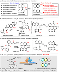 Atropisomerism is a phenomenon whereby the constrained rotation of σ bond leads to the formation of stereoisomers. Atropisomers are considered to be useful frameworks because of their unique structure and function [1–3], which is also key component of catalysts [4], natural products and medicines [5,6]. Among them, binaphthol, a representative privileged architecture of chiral ligand, has played an important role in transition-metal catalysis. Thus the practical synthetic strategies of axially chiral α-binaphthol and its analogs have been extensively investigated over the past decades, including (1) oxidative coupling of two units [7–11], (2) asymmetric addition or rearrangement followed by chirality transfer [12–19], (3) stereoselective functionalization of racemic or prochiral precursors [20–26] and (4) de novo arene formation (Scheme 1a) [27–29]. In sharp contrast, successful synthesis and application of non-α-binaphthol remain limited [30,31], probably due to the conflicts between the inherent reactivity and desired regioselectivity for β-binaphthol synthesis.