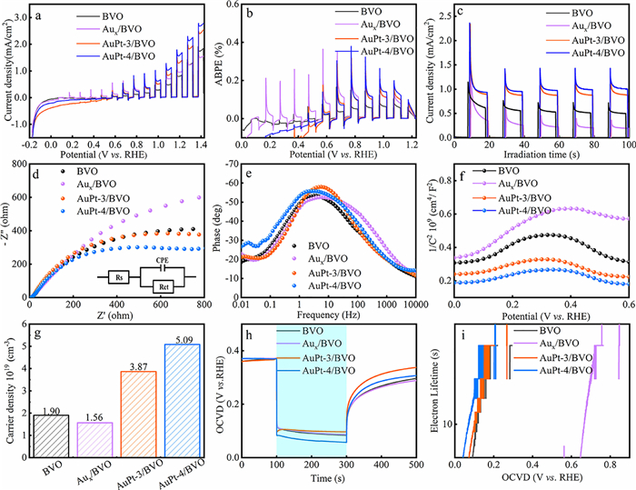 Fig. 3. PEC water oxidation activities of BVO, Aux/BVO, Au1-xPtx-3/BVO and Au1-xPtx-4/BVO heterostructures under simulated solar light irradiation (AM 1.5G) including (a) LSV, (b) ABPE, (c) transient photocurrents (I-t) (1.23 V vs. RHE), (d) EIS results, (e) Bode curves, (f) M-S plots, (g) charge density (Nd), (h) OCVD, and (i) electron lifetime (τn). |