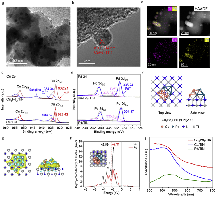 | Fig. 1. (a–c) HRTEM images, and corresponding EDS elemental mapping of Cu3Pd2/TiN. (d) High-resolution Cu 2p XPS spectra of Cu3Pd2/TiN and Cu/TiN. (e) High-resolution Pd 3d XPS spectra of Cu3Pd2/TiN and Pd/TiN. (f) Top and side views of the Cu6Pd4(111)/TiN(200). (g) The corresponding charge density difference of Cu6Pd4(111)/TiN(200) structure. (h) The projected density of states (pDOS) plots of the d-orbitals for Cu and Pd with Bader charge analysis inserted. (i) UV–vis DRS spectra of Cu3Pd2/TiN, Cu/TiN and Pd/TiN measured with TiN as the reference. | |