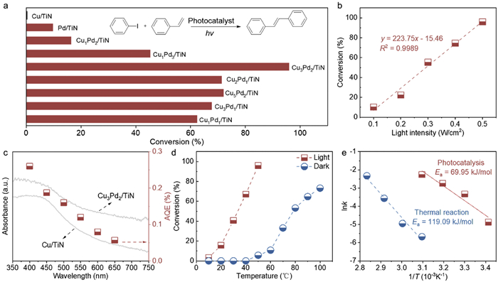 | Fig. 2. (a) Photocatalytic performance of Heck reaction using catalysts with different Cu/Pd ratios under visible light irradiation at 50 ℃. (b) Dependence of the photocatalytic activity on the light intensity using Cu3Pd2/TiN catalysts for Heck reaction. (c) The action spectra for Heck reaction. UV–vis DRS spectra of Cu3Pd2/TiN and Cu/TiN were included for comparison. Reaction activities presented as apparent quantum efficiencies (AQE) are plotted against the wavelength of irradiation at 400, 450, 500, 550, 600 and 650 nm (light intensity 0.5 W/cm2). (d) Catalytic activity of Cu3Pd2/TiN catalysts for the Heck reaction at different temperatures under visible light irradiation (red dot) and thermal dark conditions (blue dot). (e) The kinetic study of the photocatalytic reaction and thermal reaction. | |