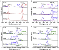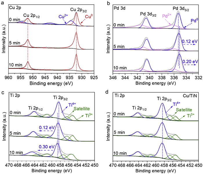| Fig. 3. In-situ high-resolution XPS spectra under visible light irradiation (0–10 min): (a) Cu 2p, (b) Pd 3d, (c) Ti 2p XPS spectra of Cu3Pd2/TiN and (d) Ti 2p XPS spectra of Cu/TiN. | |