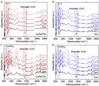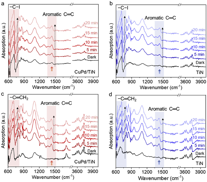 | Fig. 4. In-situ DRIFTS spectra of iodobenzene and styrene adsorbed on catalysts. (a, b) Infrared spectra of iodobenzene on Cu3Pd2/TiN catalysts and on TiN support under continuous visible light irradiation. (c, d) Infrared spectra of styrene on Cu3Pd2/TiN catalysts and on TiN support under continuous visible light irradiation. | |